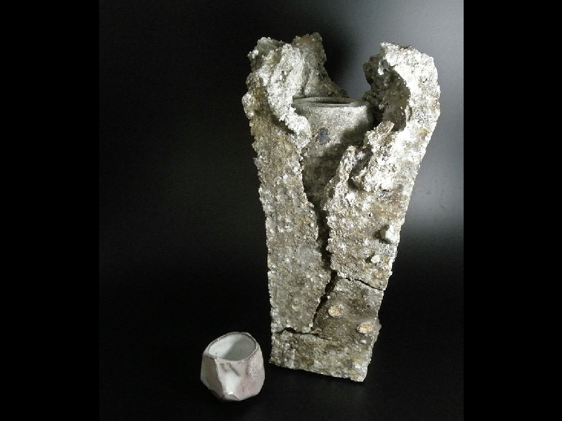 En este jarrón Iga la forma externa desgarrada abraza -y se abre- a la forma interior definida. La idea de la obra es sencilla: parece también abrirse -como una flor- asociándose a lo orgánico (larva, semilla, árbol…) a lo mineral, o a los fósiles: al cambio….al rastro y/o resto del animal o planta que une ambos mundos.
